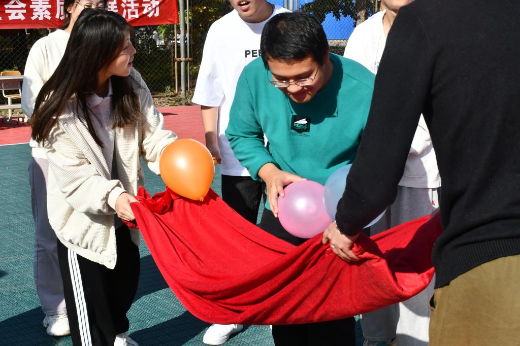 本次素质拓展活动共有五个项目,分别是筷子传套圈、平衡球、正话反说、桃花朵朵开和两人三足踩气球。活动中学生按部门组成小组,每个小组通过团结协作完成一系列有趣的任务。其中,在平衡球项目中,各个小组展开了激烈的讨论,方法更是“八仙过海——各显神通”。两人三足踩气球游戏中更显出了同学们的活力四射。男生的“战术表现”相当精彩,女生也彰显了巾帼风范。这些游戏项目不仅加深了学生之间的相互了解,还锻炼了大家的协作能力和沟通能力。在中场休息的听歌识曲活动中,同学们同样展示出了交通学子蓬勃朝气,争相抢答,活动现场洋溢着青春的气息。