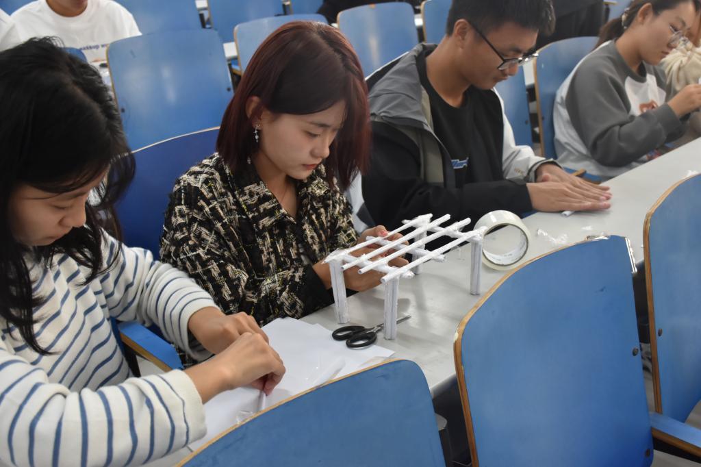 比赛开始前,工作人员介绍比赛的相关要求及注意事项,并邀请2022届“承重冠军”——交通运输2022-1班代表逄婷分享“造桥”经验。逄婷对于纸桥的各种结构进行了简单介绍,向各参赛选手送出了鼓励与祝福。比赛正式开始,各参赛小组的选手们按照各自的分工,有条不紊地开始构筑属于他们的“桥梁”。一揉,一压,一卷,一粘,一张张单薄的A4纸很快变成了一个个坚固精巧的构件,选手们满溢欢喜的眼光中仿佛已映出了完整的纸桥形态。在激烈的角逐后,经过严格的评选,最终交通运输2023-3班获得本次比赛一等奖,智慧交通2023-2班获得二等奖,交通运输2023-4班获得三等奖。