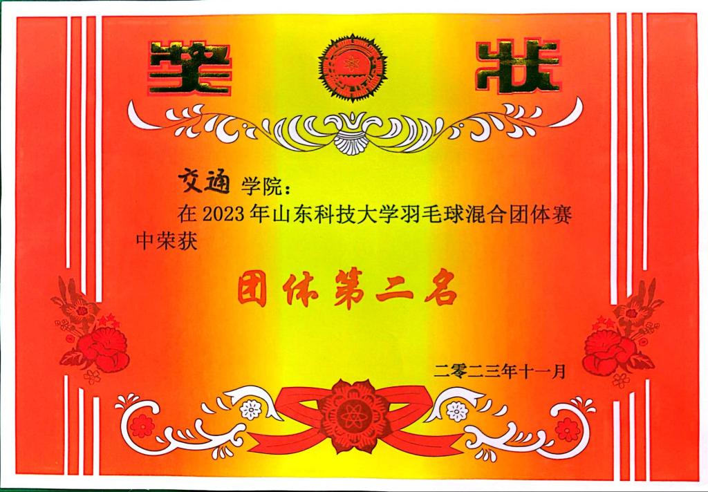 本学期学院各项体育运动再创佳绩,在山东科技大学第十七届学生乒乓球比赛中荣获女子团体第二名,山东科技大学羽毛球混合团体赛中荣获团体第二名,交通运输2020-3班徐钰晟在2023年山东省大学生田径锦标赛中荣获男子甲组400米冠军,并打破学校记录。下一步,交通学子将继续发扬拼搏精神,在学习工作中再接再厉,争创更加优异的成绩。