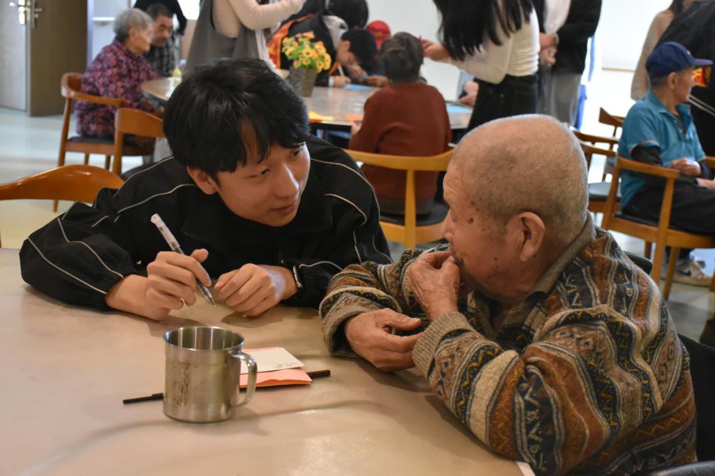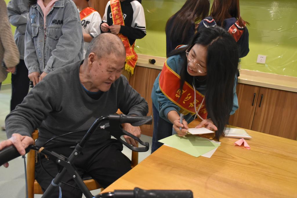 考虑到部分老人有不同程度的残疾,志愿者们还贴心设计了一系列适合他们的互动游戏,如写祝福贺卡、折纸等,进一步增强了活动的参与感和趣味性;志愿者们走到老人身边,轻声与他们沟通,俯身写下吉祥话,深情表达着对老人们最真挚的祝福。温暖的午后,金色的阳光洒落在老人们慈祥的面庞,看着围在身边的孩子们,有的老人不禁流下感动的泪水,大家相对而坐,诉说着匆匆那年光阴的故事,温暖又祥和。