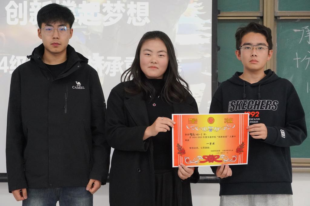 赛前,工作人员详细介绍了比赛规则及注意事项,并邀请了往届比赛的优秀选手进行经验分享。比赛现场,学生们从最初的构思研讨到精心裁剪纸张,结合所学的专业知识,在脑海中勾勒出纸桥的雏形,经过裁剪后,保留最契合承重结构的部分。最终的成型环节,学生们将各部件进行细致的粘贴组装,让每一片纸张紧密相连,共同构筑起纸桥稳固的“筋骨”。期间,小组成员们不时交流讨论,对设计方案进行实时调整优化,力求让纸桥在后续的承重测试中展现出最强实力。承重测试环节,一块块砝码被谨慎地放置于纸桥之上,每增加一份重量,都是对参赛人员知识与实践成果的一次考验。各组精心构思的纸桥承载着不断累加的砝码,一次次突破预期承重量,引发了在场观众的由衷赞叹。最终,智慧交通2024-1班获一等奖,交通运输2024-2班获二等奖,交通运输2024-1班获三等奖。