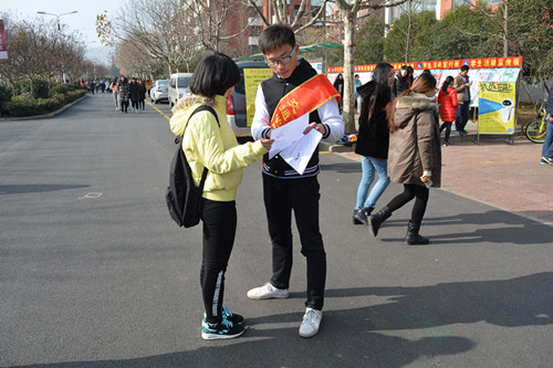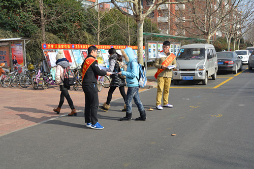 宣传过程中,服务队“志载人生风采,愿为交通未来”小组队员身着绶带,在向过往同学分发宣传单页的同时向他们详细介绍交通安全日的相关知识,并耐心解答同学们的疑问。萧瑟的冷风却挡不住志愿者们的热情,本次活动引起了更多人对交通安全问题的关注,提高了广大师生交通安全意识,同时也展示了志愿者们良好的个人形象和文明风貌。(杨建港)