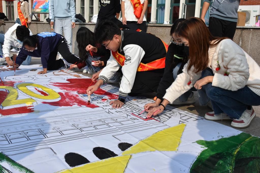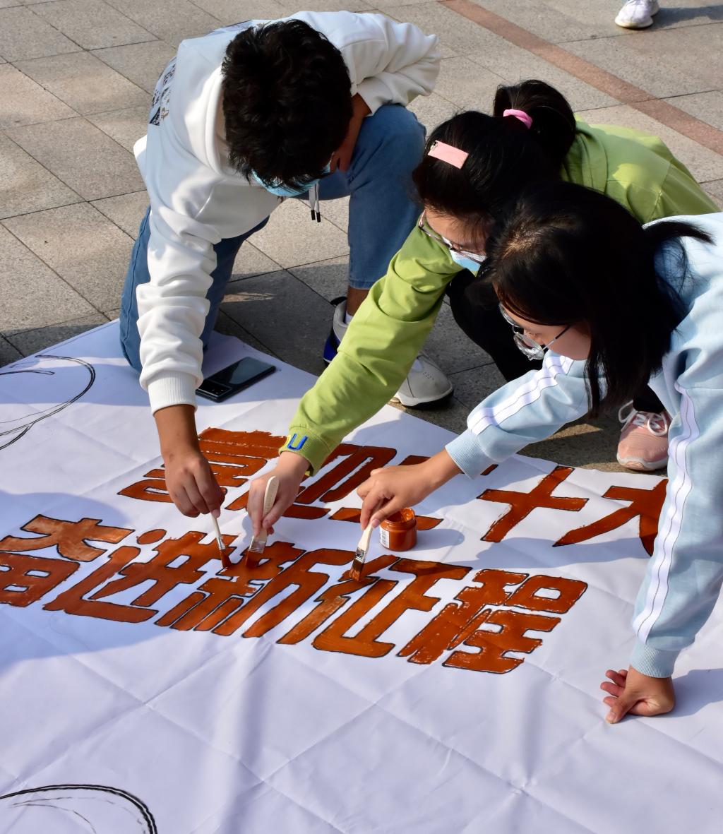 本次活动以绘长卷的形式开展——绿水青山的元素呼应了“推动绿色发展,促进人与自然和谐共生”的发展理念。“如果信仰有颜色,那一定是中国红”,威严的天安门和火红的旗帜象征着中国共产党为人民谋幸福的不懈追求,朵朵祥云与林立的高楼,代表着人民对美好生活的向往。同学们手拿画笔、神情专注,将红色基因元素生动地呈现在画卷上,一涂一画间,洋溢着对祖国的热爱、对党的热爱。最终经过一个多小时的密切配合,一幅色彩斑斓、凝聚着爱国真情的画卷呈现在眼前。