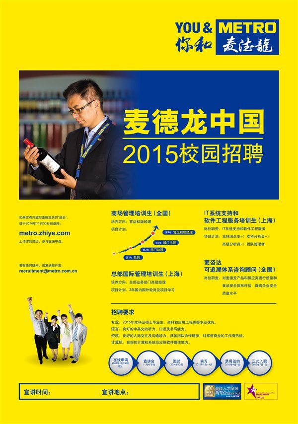 2 | 管培生 | 物流类、管理类、应用工程类专业优先 | 本科及硕士 | 全国(详见海报) | 2014年11月18日下午2:00(星期二)到青岛农业大学教学区A308参加宣讲会及笔试答题 |