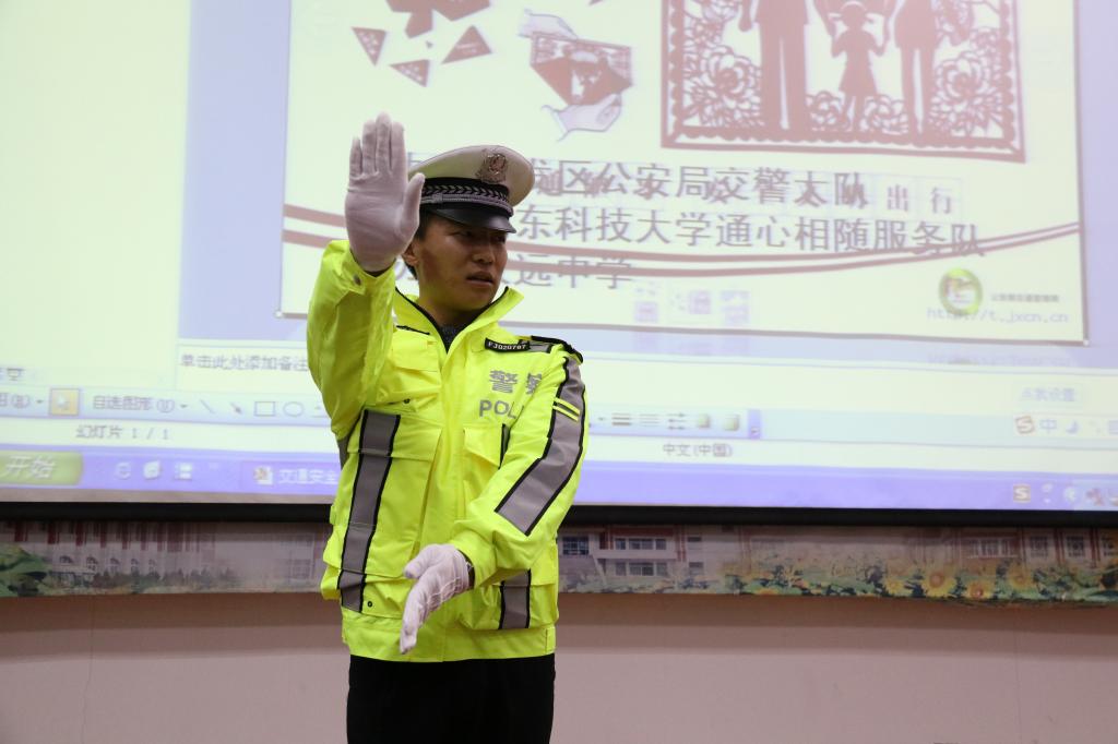 活动伊始,崔向前科长详细阐述了交通安全相关问题的现状和交通安全宣传教育的重要性,希望中学生培养交通安全意识,增强自我保护能力;交警支队黄岛大队民警孟庆海给学生们讲解常见的交通指挥手势,交警支队黄岛大队民警薛亚东亲身示范了交通指挥手势;交警支队黄岛大队宣传科民警苗志勋结合PPT和视频等形式运用交通事故实例,就自行车使用常识、乘车注意事项、爱护交通设施、处理交通事故等方面知识进行了讲解。活动过程中,同学们热情高涨,积极与警官互动,认真学习交通安全知识和交通指挥手势。最后,管洪波主任对本次活动进行总结。他指出,遵守交通规则是每个人的责任和义务,中学生要自觉维护交通安全,提高自我保护意识。
