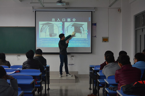 此次预选赛分为选手答辩和评委提问两部分。比赛开始,各参赛队伍代表依次上台就作品的创作背景、创新理念、作品优势、研究过程以及现阶段得出的结论进行了详细的阐述。比赛过程中,各组选手结合理论知识与实地调查,利用仿真软件、动画演示等多种方式进行了精彩的答辩。他们条分缕析、清晰明了的讲述,思维奇特、创新大胆的设计,方便快捷、经济环保的作品赢得了评委的肯定与认可。随后,评委根据选手的作品及阐述提出问题,并且结合专业知识指出各组作品的不妥之处,同时给予参赛队员切实中肯的意见和指导性的建议,令同学们受益匪浅。