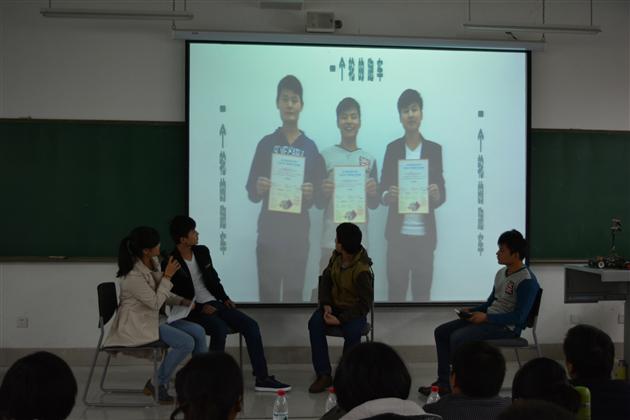 访谈主要分为“解疑答惑”、“赛前准备”及“经历分享”三大模块。解疑答惑环节,队长谢超通过一段宣传片介绍了光电组、电磁组及摄像头组三个组别赛车的传感器原理及其难点,分析了赛道年年不同的原因。针对主持人的提问,他们进一步解答了赛道对车子控制的要求及车子对赛道如何辨别的问题。赛前准备环节,谢超详细地介绍了电路板制作、软件学习、材料准备和仪器的熟悉过程,以及如何组队,如何合理分配时间的问题。此外,三位同学从材料准备到车子工作原理研究再到“人字路”的改进等方面分享了参赛的心得。在互动环节中,现场同学纷纷在纸片上写下了自己的问题,老师和嘉宾们也针对一些代表性问题作了详细解答。