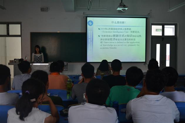 孟丽华老师主要讲述了创新与专利申请两个大方面的内容。在创新方面,她介绍了创新对发展的驱动作用,创新的现状与困惑及创新的方法与体系。孟老师指出,与欧美、日韩等发达国家相比,我国的创新水平还处于落后状态。针对原始创新、集成创新及引进消化吸收再创新三种创新类型,她提到我国引进国外创新居多,而极不善于推陈出新。利用一个平均分割小游戏,孟老师与现场的同学达成了良好的互动,并引出思维定势的问题,气氛空前热烈。对于专利申请方面,她介绍了创新点、检索、实施(基础试验,样品制作)、准备申请文件、寄交或网上申请五项基本过程,并借助一个伸缩型耳机的实用新型专利案例解释了专利撰写,专利说明书,权利要求书及图示的结构与囊括内容。讲述过程中,同学们都聚精会神,积极互动,现场形成良好的学术氛围。