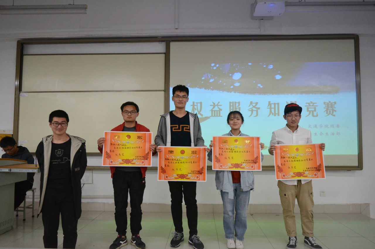 本次知识竞赛共分为选择题和简答题两个部分,每一部分开始前由每队队长抽签决定比赛上场顺序。第一部分选择题开始,各参赛队伍全员出战,通过抢答主持人在幻灯片所列的权益知识题,来获得进入下一轮比赛的资格。参赛队员们在回答问题时,时而眉头紧锁,时而激动不已,现场气氛火热。在第二部分的比拼中,参赛团队反应逐渐变得更加敏捷,充分展示了丰富的权益知识储备,保证了超高的正答率,比分交替攀升,难分伯仲。最终,经过激烈角逐,交通工程二班代表队荣获一等奖,交通工程一班和交通运输二班代表队获得二等奖,交通运输一班、车辆工程四班和物流工程一班代表队获得三等奖。