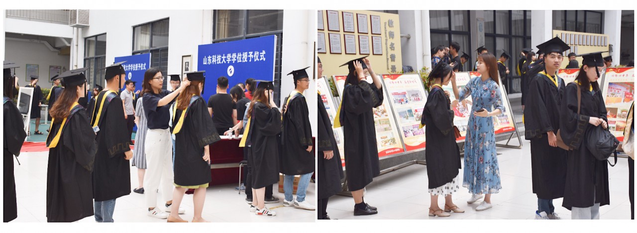 在神圣庄严的气氛中,毕业生们身着学士袍,意气风发,笑容洋溢,等待着他们人生中具有里程碑意义的神圣时刻。期间,刘倩婧和董淑敏两位老师为毕业生整理衣帽,师生深情,溢于言表。随后,毕业生们上前对尹书记深鞠一躬,表达对授业恩师最真挚的谢意。尹书记与每一位毕业生亲切握手,并为他们拨穗正冠,颁发学位证书,眼神中流露出对毕业生们的赞许。拨穗正冠象征着山科学子已学有所成,羽翼已满,可以勇敢坚定地迈向未知的社会和未来。这是学校对毕业生的肯定与期望,也见证了莘莘学子四年来的努力与汗水,期待他们能不负学校厚望,开启人生新的篇章。J13教学楼前设立的“一朝师生情,毕业缅于怀;学子闯天下,母校候佳音”的横幅上写满了毕业生的签名,笔笔入情,字字由心,流露的是山科学子们满满的不舍与留恋。尽管他们即将远行,无论去往何方,这里永远承载着他们的青春年华和热血岁月,山东科技大学永远都是他们的家。