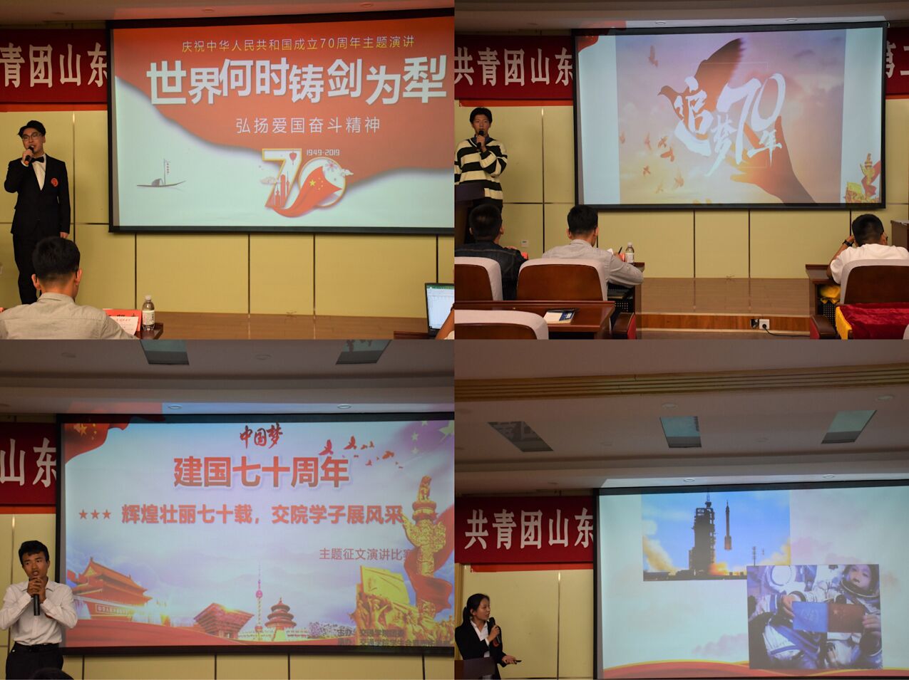 比赛共分为主题演讲和即兴演讲两部分。十位选手依次上台演讲,从各种角度出发来展示新中国成立70周年来的变化与发展。其中,王睿聚焦飞速发展的经济方面,“一带一路”、“精准扶贫”、“亚投行”等各项事业取得历史性成就,货物贸易总额第一、外汇储备余额第一、高铁里程第一、银行规模第一……70年砥砺奋进,70年披荆斩棘,一串串数字向世界展示了中国速度,十分振奋人心。李硕从历史角度纵观过去与未来,回首过去,缅怀先辈们抛头颅洒热血的峥嵘岁月;展望未来,喝彩当代人不惧经济制裁,用奋斗搏取未来华夏的繁荣,内容饱满,言语铿锵,现场师生深受鼓舞,气氛热烈,掌声不断。最终2019级李硕获得一等奖,王睿,蒋崇获得二等奖,程琳,王任卿,李庆航获得三等奖,苏伟杰,张月,郭晨,彭璐获得优秀奖,交通工程一班获得最佳组织奖。