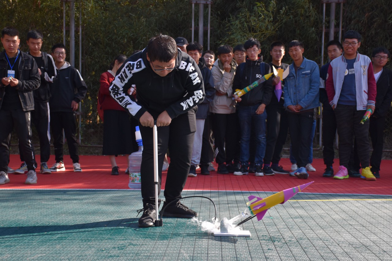 第一项评比内容为“外观”,各评委依据参赛队伍制作的水火箭外观进行打分。参赛者们别出心裁、匠心独运,以矿泉水瓶、纸板等作为原材料制作而成的各式各样的水火箭成为赛场上一道靓丽风景。第二环节则以“射程”远近为标准,将参赛队伍分为A、B两组同时进行比赛。各参赛队伍向火箭舱灌入水,再利用打气筒充入空气,到达一定压力后进行发射。只见一支支水火箭以惊人的速度飞向天空,划出一道道完美的发射轨迹,现场观众发出阵阵高呼,气氛愈发热烈。比赛间隙,大艺团声乐队队员赵雪飞和苏郭鑫共同演唱歌曲《往后余生》,悠扬的歌声缓解了现场的紧张气氛。最后,比赛以第三项“精确度”为标准进行评比。该环节需要参赛者自行调节发射器角度进行发射,再次考验了队员之间的默契配合及动手能力。