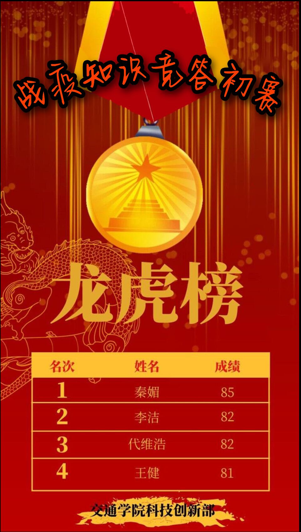 “弘扬五四精神,青年‘疫’往无前”战“疫”知识竞赛,该竞赛响应了“全民争做疫情防控的践行者和宣传者”的国家号召,全方位、深层次地考察学生对疫情防护的了解情况,帮助同学们深化对疫情防护知识的掌握,也激发了自身学习知识的积极性。