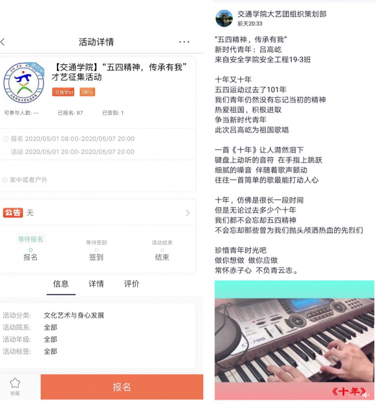 必赢776net学生会大艺团为 “五四精神,传承有我”才艺征集活动的举办,为同学们提供了一个锻炼和展示自己的平台,展现了交通学子积极向上、活力自信的精神风貌,营造了爱党爱国,自强不息的文化氛围。