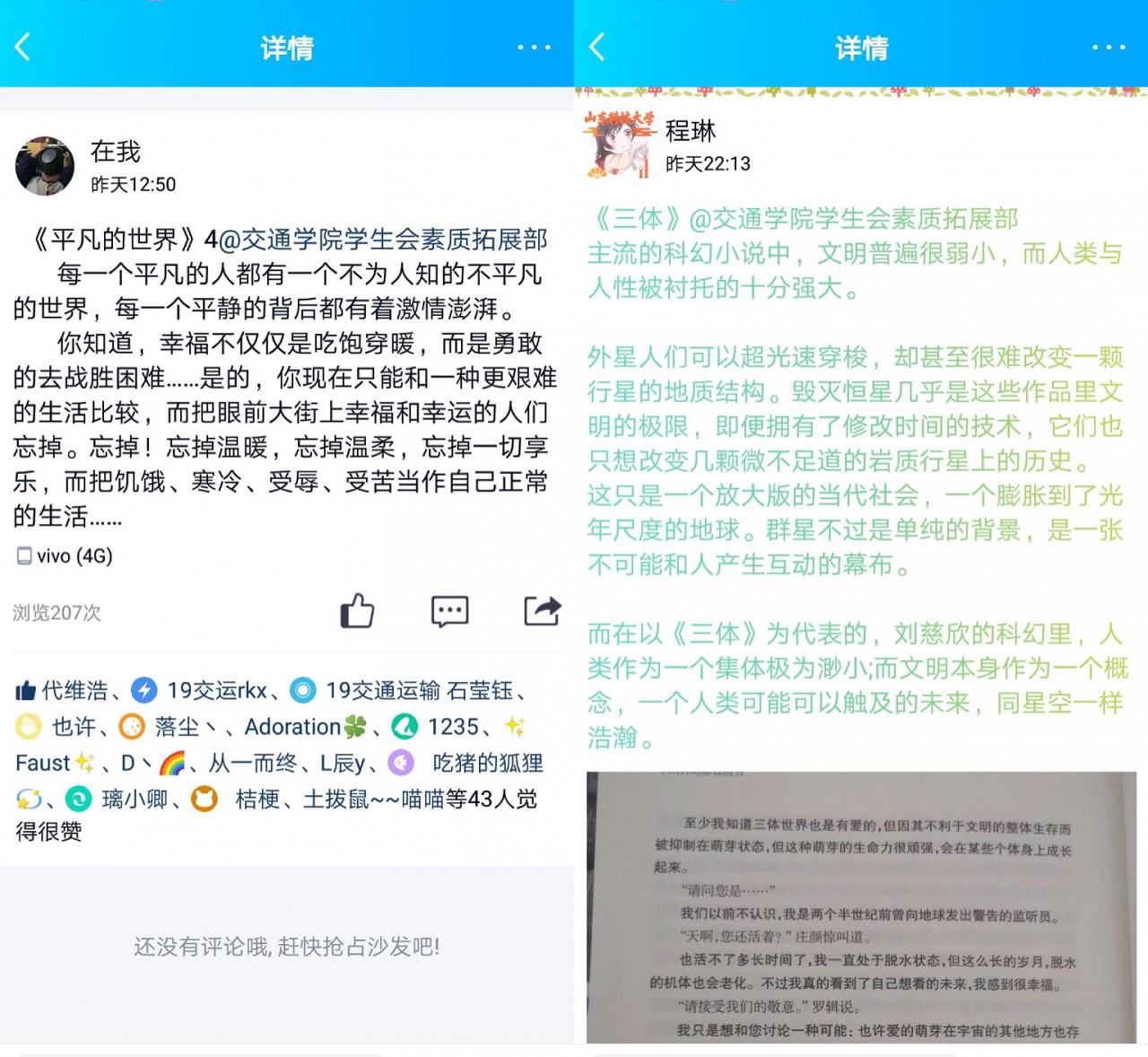 “书卷中的薪火传承”读书打卡活动,通过对优秀文学作品的阅读体会与感悟分享不仅使学生们增强了读书兴趣,培养了阅读的习惯,同时引导同学们从书籍中感受五四精神;“抗疫有我,青春同行”约跑活动鼓励同学们走下网络、走出家门,积极锻炼、强健体魄,充分展现了当代新青年的蓬勃朝气。