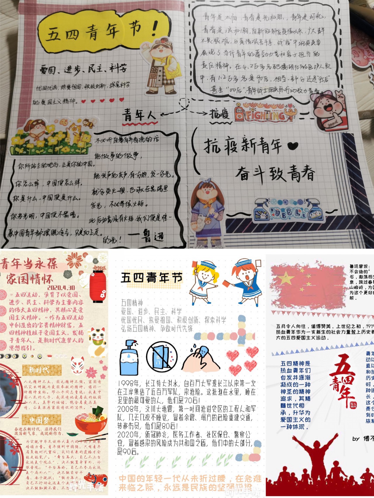 “弘扬五四精神,争做时代先锋”手帐征集大赛中,同学们纷纷拿起画笔,以精美的手帐作品生动地记录和分享疫情期间发生的感人事迹,赞颂舍生忘死、坚强勇敢的英雄品质。