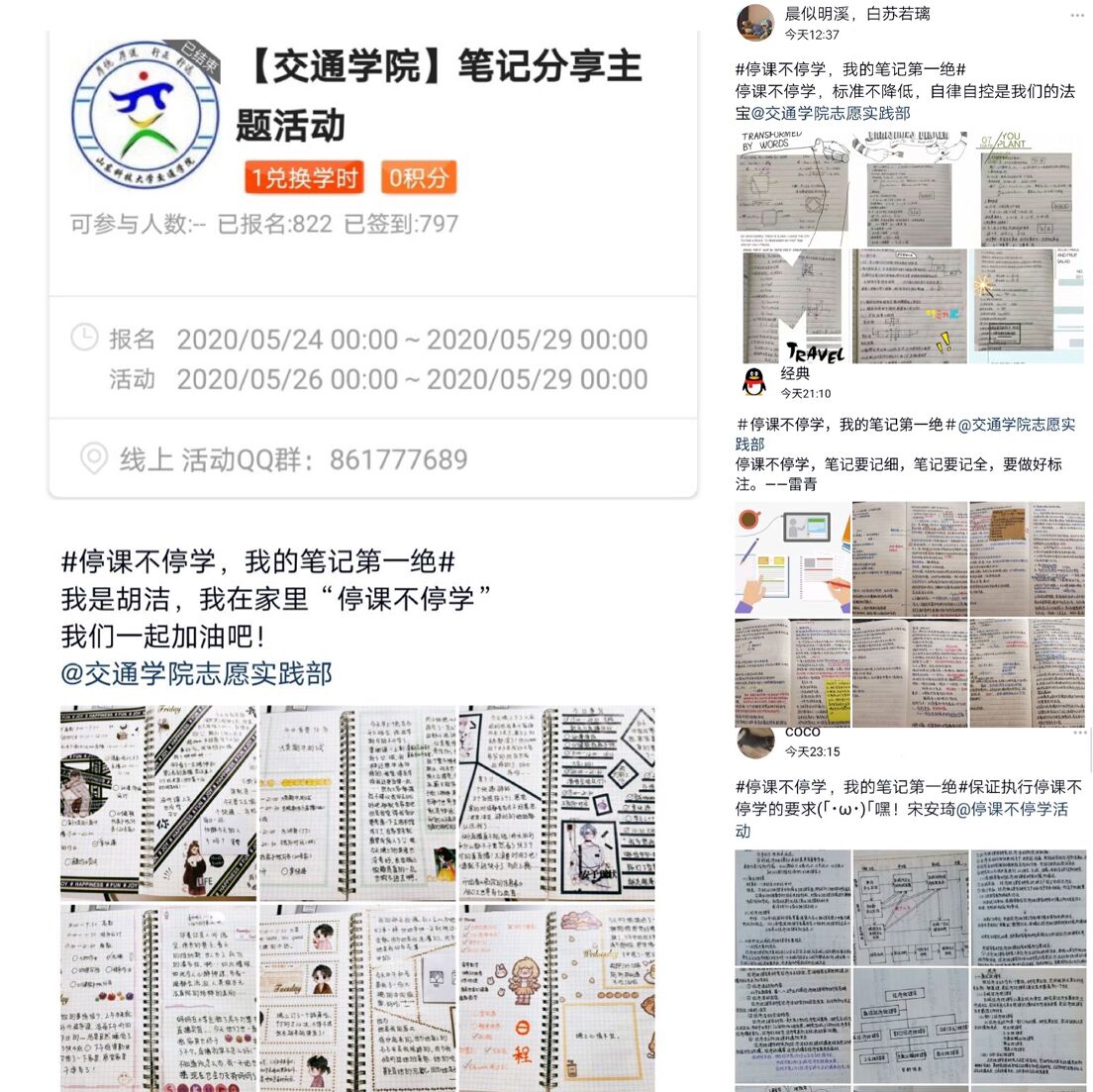 为积极响应“停课不停学”的号召,营造勤于学习、善于思考的学习氛围,5月26日至29日,必赢776net开展了“停课不停学,我的笔记第一绝”笔记分享主题活动。本次活动面向全校学生开展,共有797人参加。