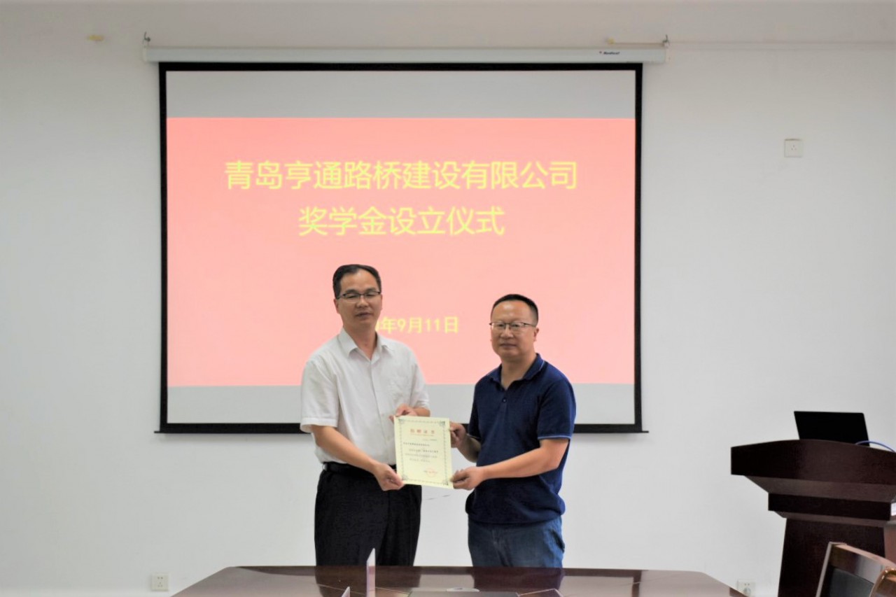 与会人员就奖学金设立的目的和用途进行深入交流并达成一致意见。他表示,青年大学生是国家的未来,不能让学生因贫困而失学,希望此项奖学金的设立能够帮助有困难的学生学习上进,励志成才。苗汝昌代表学院对青岛亨通路桥建设有限公司表示感谢,并为其颁发捐赠证书。