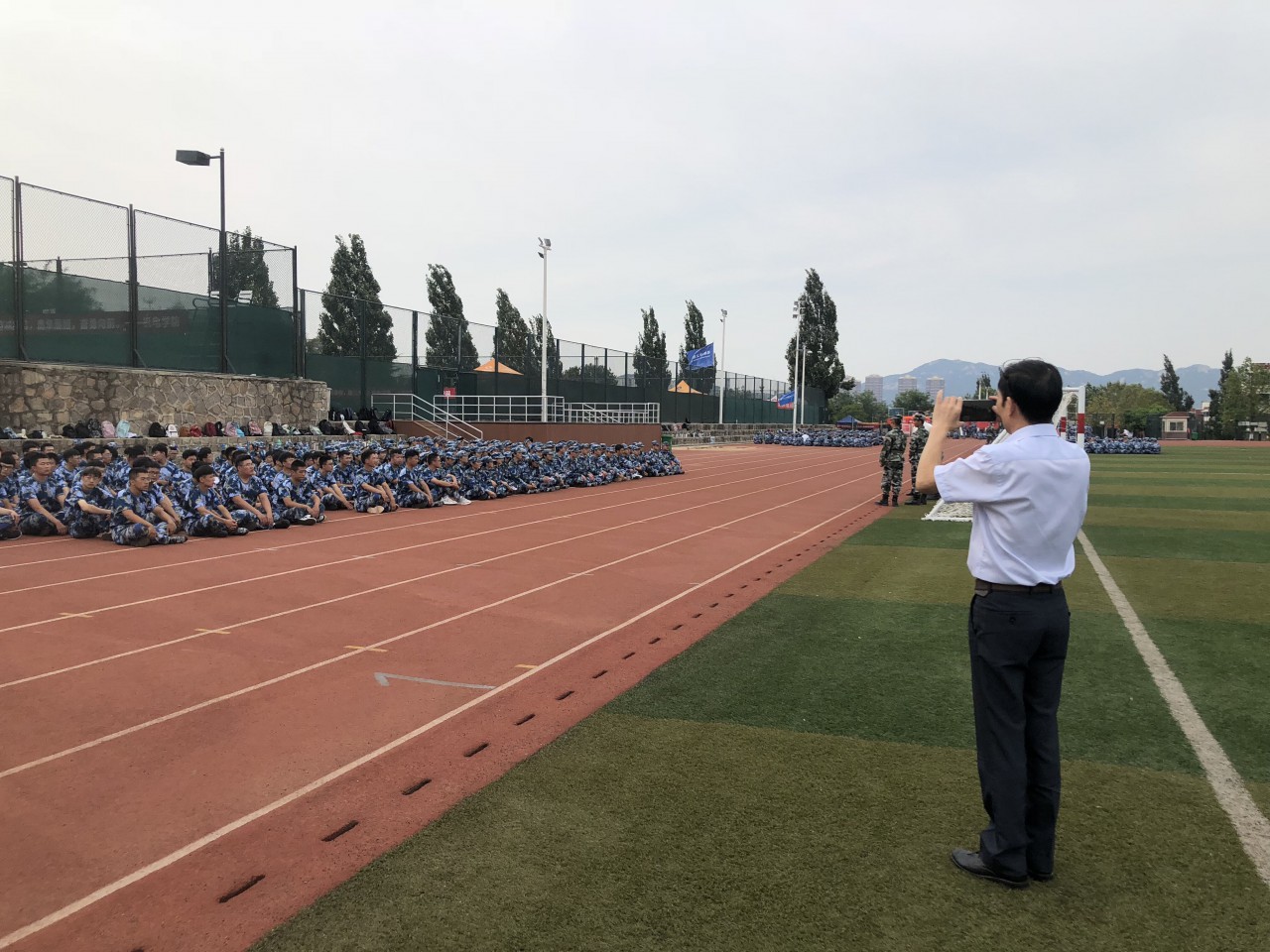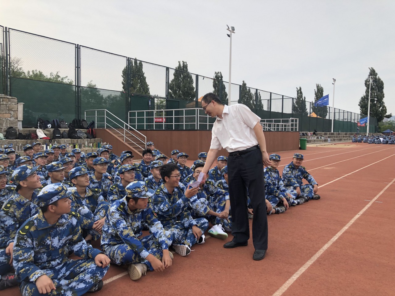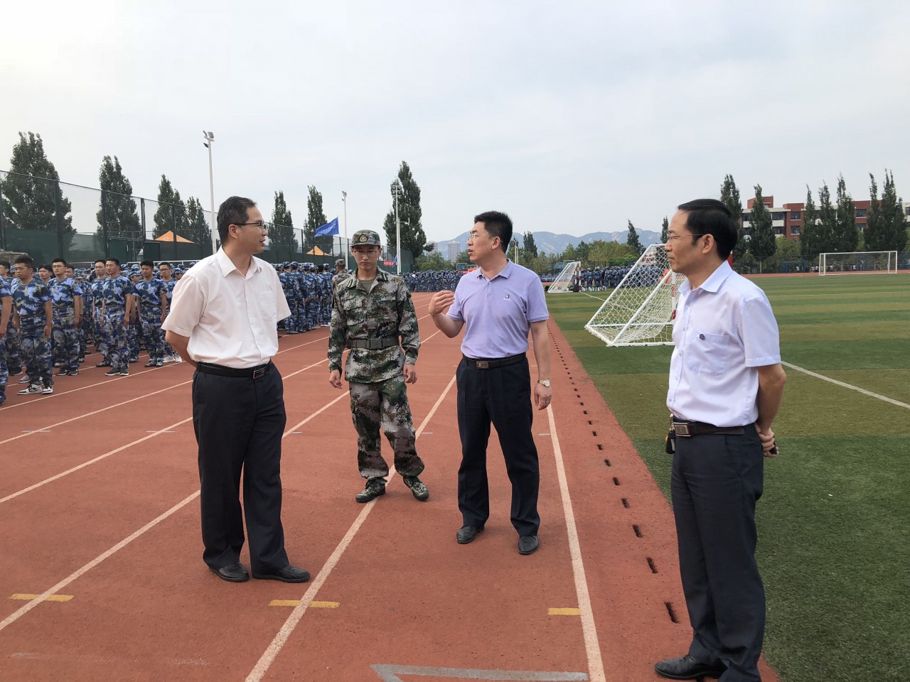 9月21日,必赢776net党委书记苗汝昌、院长辛嵩、党委副书记兼副院长李勇一行来到军训场地,亲切慰问军训教官和新生。