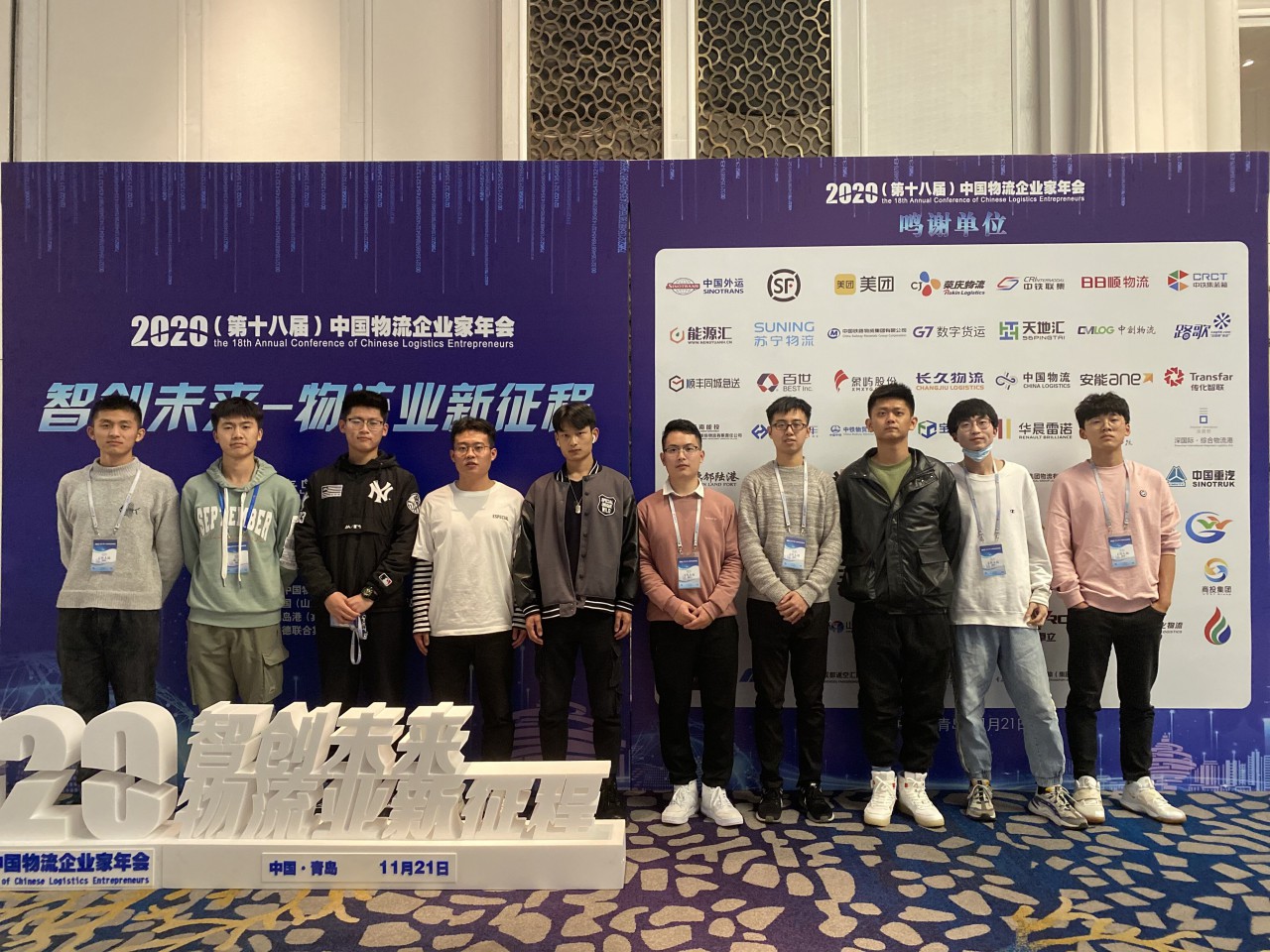 11月21日,“2020(第十八届)中国物流企业家年会在青岛西海岸新区召开,来自中国外运、中国物流、顺丰集团、京东物流、苏宁物流、日日顺、美团配送、德邦等国内500余家物流企业的高管及行业嘉宾,以及来自中国物流与采购联合会、青岛市人民政府、山东港口集团和青岛自贸片区等政府部门代表共1200余人共襄盛会。山东科技大学必赢776net任泳兆、王超等10名同学作为山东科技大学志愿者参加了此次年会。