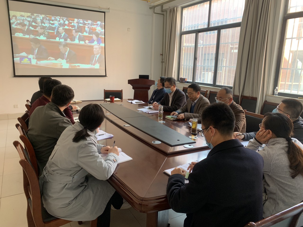 会上,认真学习了《2021年政府工作报告》和《中华人民共和国国民经济和社会发展第十四个五年规划和2035年远景目标纲要》,集体观看了《十三届全国人大四次会议在京开幕》、《习近平在参加内蒙古代表团审议时强调 完整准确全面贯彻新发展理念 铸牢中华民族共同体意识》、《习近平在出席解放军和武警部队代表团全体会议时强调 实现“十四五”时期国防和军队建设良好开局 以优异成绩迎接中国共产党建党100周年》和《习近平在参加青海代表团审议时强调 坚定不移走高质量发展之路 坚定不移增进民生福祉》等视频材料。