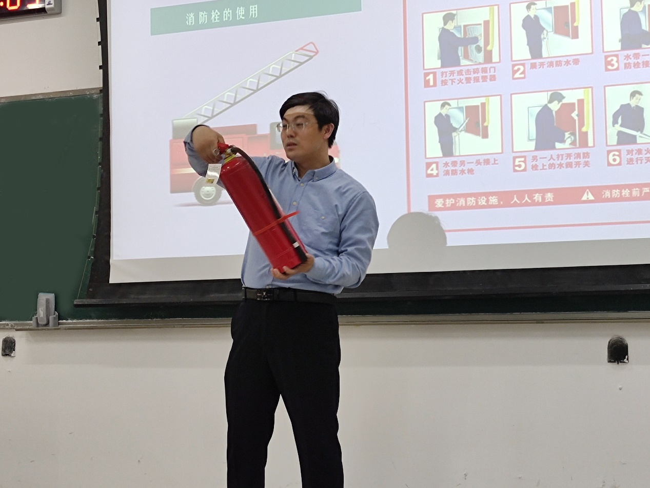 王海军分别从交通安全、财产安全、消防安全、活动安全、食品安全和国家安全六个方面展开,向同学们详细讲解了校园安全问题,普及了安全教育知识。在交通安全方面,王海军指出,由于校园内人员居住集中,上、下课时容易形成人流高峰,高校的交通环境日益复杂,交通事故时有发生,以亲切的口吻向同学们介绍了交通事故的预防和处理办法,提醒同学们时刻注意交通安全。针对财产安全问题,王海军强调,高校大学生已经成为犯罪分子侵害的主要群体之一,层出不穷的电信诈骗必须引起同学们的重视和防备。在介绍消防安全问题时,王海军亲身操作,向同学们示范了灭火器的正确使用方法。通过观看国家安全机关破获间谍窃密案的视频,在场的同学们深刻领悟到了严守国家机密、守护国家安全的重要性。