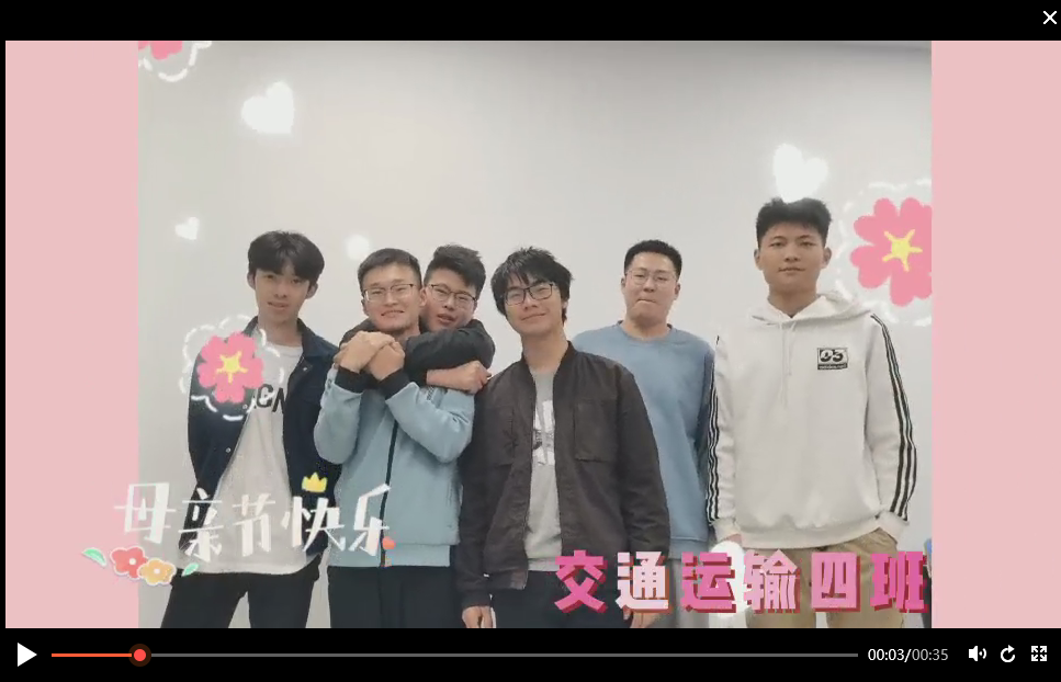 活动中,交通工程20-1班的同学们执笔为自己的母亲写下一封信,落笔情深,一封封信真挚感人,朴实的语言表达了母亲与子女间的伟大深情。交通运输20-3班的刘增智和邵安永歌唱《听妈妈的话》歌颂母亲,动人的旋律、温暖的歌词处处表达着对母亲的孝顺和感激;唐和、张文馨、房兴玥和刘璇的朗诵《献给母亲的话》催人泪下,她们用细腻的话语述说着内心的悄悄话,回忆母亲的微笑与怀抱。交通运输20-4班组织同学们在母亲节这天给自己的妈妈打视频电话,和妈妈叙叙日常,亲口向妈妈说一句“妈妈我爱您,祝您节日快乐”。同时他们利用白天空余时间录制了一个集体视频发送至学生家长群,祝福每一位妈妈节日快乐,感人至深。