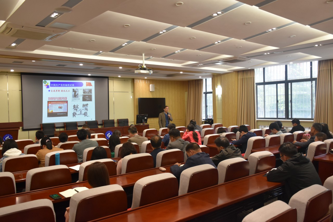 辛嵩从中国共产党在新民主主义革命时期完成救国大业、中国共产党在社会主义革命和建设时期完成兴国大业、在改革开放和社会主义现代化建设新时期推进富国大业、中国特色社会主义新时代推进本世纪中叶实现强国大业四个方面介绍了中国共产党走过的筚路蓝缕、矢志践行初心使命的百年征程。紧接着,辛嵩对中国共产党百年历史和积累的宝贵经验进行了总结,结合学院实际情况和发展现状,以及学院建设发展过程中存在的一些问题,介绍了中国共产党的秘密武器:远大理想,凝聚人心;知行合一,探索道路;依靠人民,力量无穷;思想教育,卓有成效;精神激励,永放光芒;人道主义,化敌为友;自我革命,拨乱反正。
