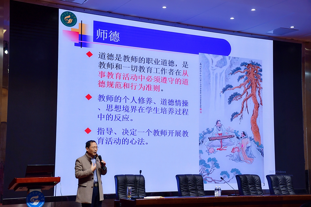 院长辛嵩作师德师风建设专题报告。结合师德师风建设的行为准则,他强调要坚持思想铸魂,以事练心,提高工作水平;要从内心关爱学生,当好“四个引路人”,做党和人民满意的“四有”好老师。