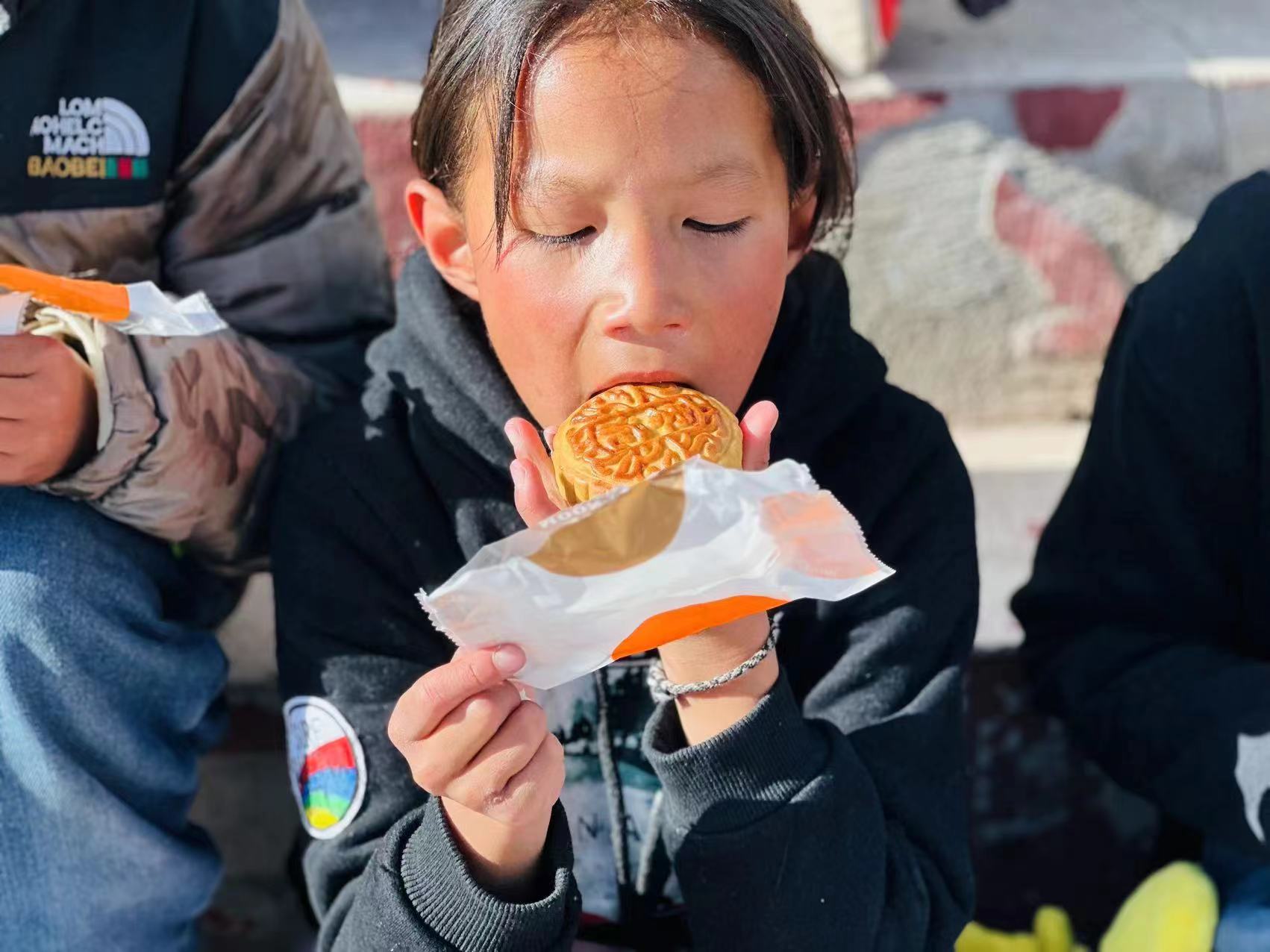 伴随着飘香四溢,一个个小巧精致的月饼新鲜出炉了。皮薄馅多的月饼在柔和的灯光下显得晶莹剔透,浅尝一口,满屋飘着一股甜蜜的枣香。“通心相随”志愿服务协会会长赵如萍表示,他们特意选择枣泥馅来制作月饼,是希望孩子们度过一个如红枣般甜蜜的中秋。待月饼冷却后,成员们进行最后一步操作,对月饼进行密封包装。他们脸上洋溢着微笑,欢声笑语间,仿佛已看到了远方孩子们的笑颜。伴着月饼的甜香一齐送至孩子们手中的是协会成员们的心意和祝福,山川江河阻隔了他们相遇的路途,但却阻隔不了他们相交的心灵。月满中秋,情满人心;尽己所能,行我所愿。在9月29日,中秋佳节这一天,协会送出的月饼跨越两千多公里的距离、四千多海拔的高度,送到了果洛藏族自治州玛沁县果洛道扎福利学校的孩子们手中,当收到孩子们吃月饼图片的那一刻,协会的志愿者们也都发自内心的流露出了一股浓浓的成就与自豪感。