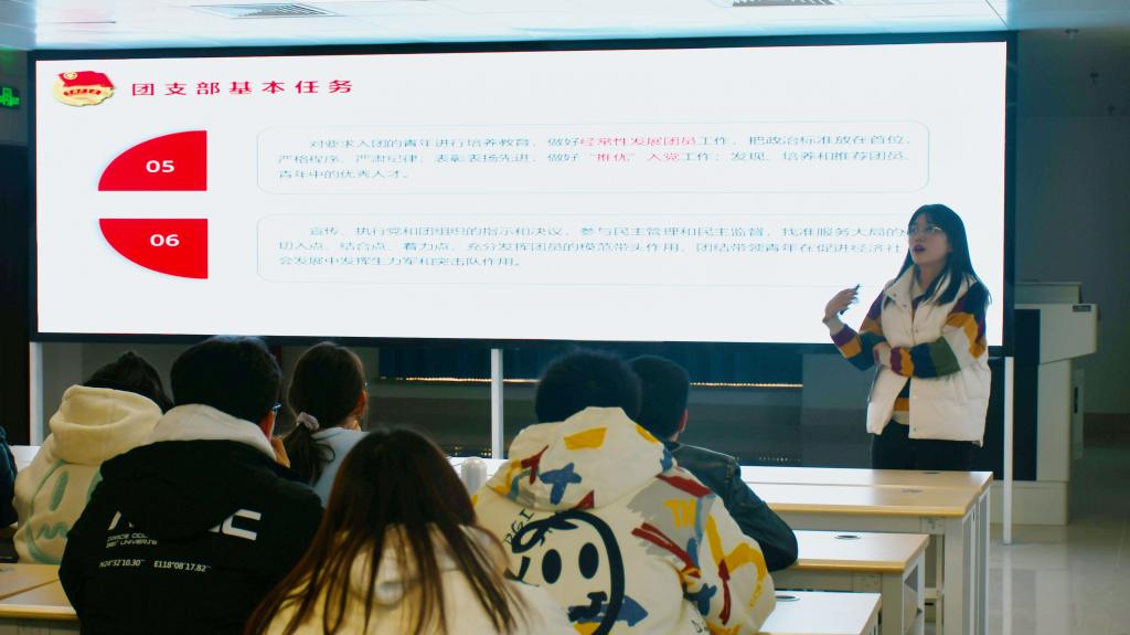刘倩婧以《走进共青团》为主题,围绕“共青团的历史与传统”“共青团的改革与创新”“全面把握从严治团”“做好新时代共青团工作”四个方面,向同学们介绍了共青团的基础知识与光荣传统,强调了全面从严治团对共青团改革的重要意义,使同学们对共青团有了更深刻的认识,进一步明确了团支委的使命担当,为学习贯彻党的二十大和团的十九大精神,做好新时代高校共青团工作明确了发展方向与奋斗目标。