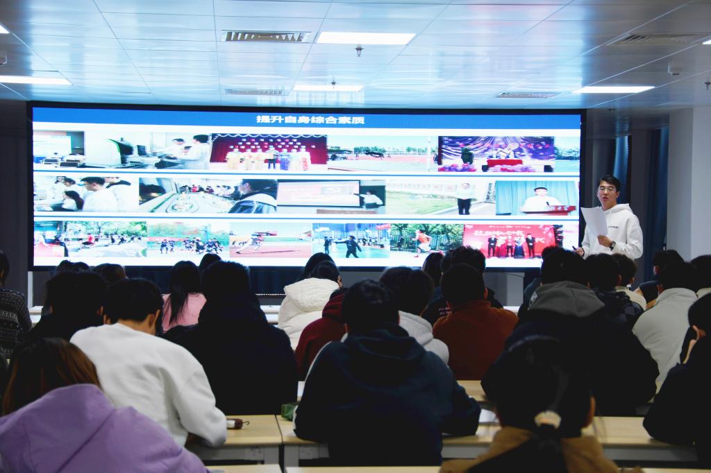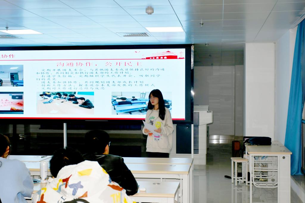 董淑敏围绕团支部组织建设与团员教育管理两方面,系统讲解了“认识团支部”“团支部的组织生活”“团员的教育管理”“先进集体与先进个人评比”等相关工作。王万楠以“牢记殷切嘱托,争做新时代好青年”为题,他表示,要学深悟透党的二十大精神,牢记习近平总书记对青年大学生的殷切嘱托,以求真务实、艰苦奋斗、开拓创新的精神,充分发挥先锋模范作用,争做“有理想、敢担当、能吃苦、肯奋斗”的新时代好青年。徐昊昊以“志愿服务聚合力,文明实践启新程”为主题,从“认识什么是志愿服务”“为什么要做志愿服务”“如何去做志愿服务”三方面细致的讲解了志愿服务的相关工作。郭铖以“大学生综合素质的提升”为主题,要求同学们要严格要求自己,提升综合素质,并发挥模范作用,积极带动身边同学德智体美劳全方面发展。赵冠群以“创新思维与实践:引领科技新时代”为主题,详细讲解了学院科技创新成果,归纳总结了参加科技创新比赛的途径,鼓励团学干部带动身边同学,积极参加科技创新竞赛。
