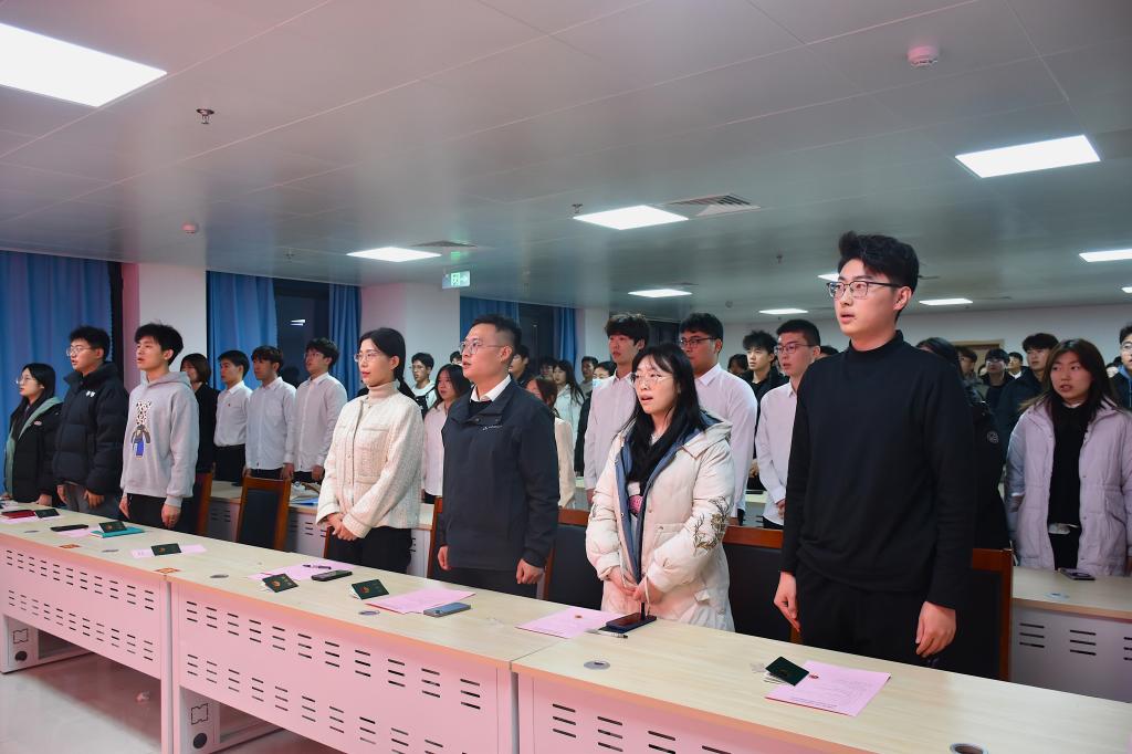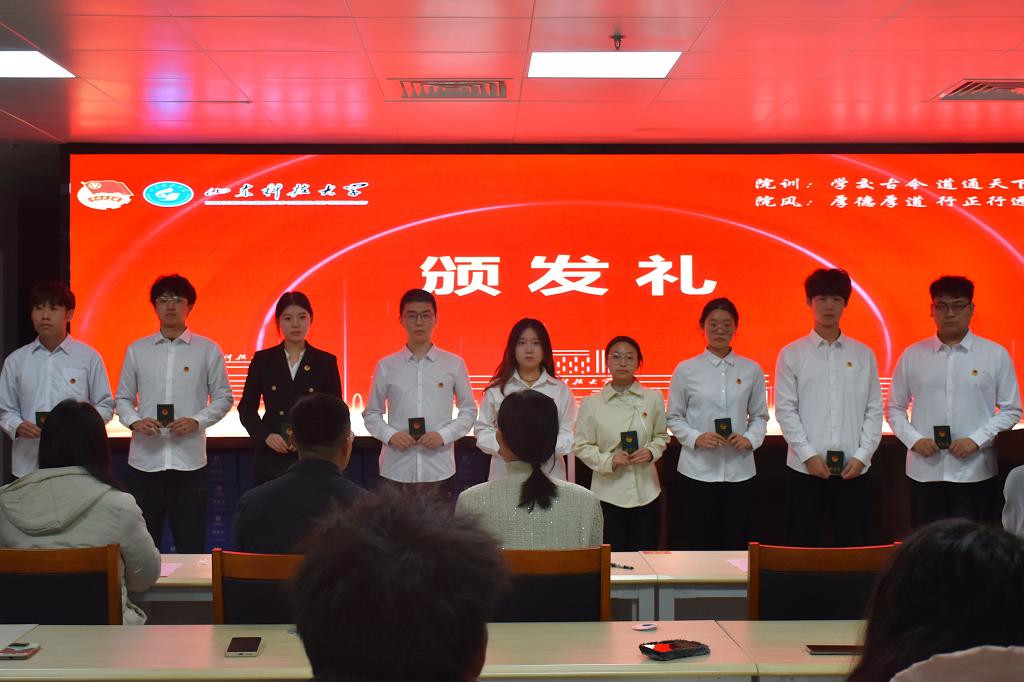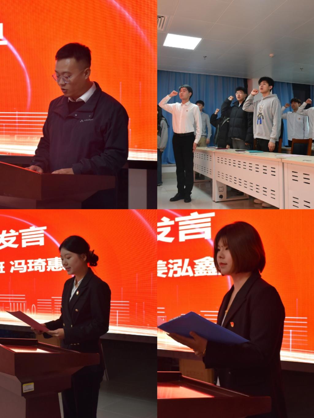 仪式在庄严的国歌声中拉开帷幕。辅导员任泳兆宣读新发展团员名单。全体辅导员为新团员颁发团员证并佩戴团徽。在领誓人陆星宇的带领下,9名新团员面向团旗庄严宣誓,全体团员重温入团誓词,表达了对组织、对信仰的庄严承诺。2023级本科生冯琦惠、2022级本科生姜泓鑫分别作为新生团员代表和优秀团员代表发言。
