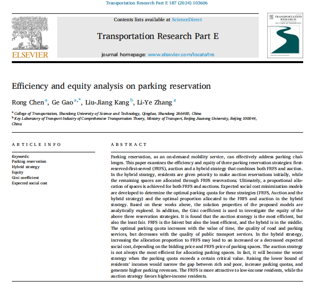 近日,由我院硕士生陈蓉 (指导教师:高歌副教授)撰写的研究论文“Efficiency and Equity Analysis on Parking Reservation”在交通运输领域TOP期刊Transportation Research Part E正式发表。