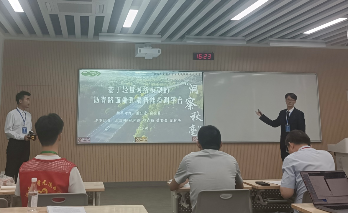 本次比赛,交通学子准备充分、发挥优异,在答辩现场,参赛队员从作品的技术原理、学术性、创新性、应用前景与市场效益进行阐述,对评委老师的提问应对自如、灵活作答,获得老师一致好评。最终,作品《“寻智探路”——基于数字孪生技术的沥青路面全过程智慧压实运维平台》(范林浩、张蕾、周国帅、李登科、阮瞳曦,指导老师:宿金菲、董仕豪)获主题赛道国家级二等奖;《基于人眼视觉特性的隧道照明优化设计与智能安全装置一体化研究》(李长星、王佳璐、徐一川、邓垚颖,指导老师:辛嵩、刘兆惠)、《暗蛟明探——“潜蛟SUMA F20”水下结构病害探查者》(陈典霞、周国帅、高立辰、徐一川、黄茹馨,指导老师:孟坤、刘倩婧)分别获得交通工程与综合交通赛道国家级三等奖、水路运输与工程赛道国家级三等奖;《“洞察秋毫”——基于轻量网络模型的沥青路面端到端智能检测平台》(周国帅、张沛遥、邓垚颖、黄茹馨、范林浩,指导老师:董仕豪、宿金菲)获得道路运输与工程赛道优秀作品奖。